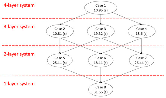 According to the experimental results, we know that the HA mechanism can always tolerate sensor faults and can accurately recover the failed protected target. Figure 7 shows the weighted system fault detection time of each case and the relationship between the cases. When a sensor fails, the proposed HA mechanism will lose part of its detection ability, thereby increasing the system fault detection time. Although in some cases, the proposed mechanism requires a longer weighted fault detection time, the time is still less than or equal to the weighted fault detection time of the system layer heartbeating. Generally, in terms of detection efficiency, the original fault model that has not been reconstructed has the best system fault detection efficiency. As the number of reconstructions increases, the performance of the reconstructed fault model decreases. Finally, the reconstructed fault model is degraded to a one-layer model, which is the worst case and has the same performance as the system layer heartbeating. In this experiment, the performance (weighted fault detection time) of the original fault model is 10.95 s, the performance of the fault models with one failed sensor ranges from 10.81 to 19.32 s, the performance of the fault models with two failed sensors ranges from 18.11 to 26.44 s, and the performance of the fault models with three failed sensors is 31.55 s. As each sensor has different system fault detection ability, the loss of different sensors has different effects on the system fault detection time. As a result, the weighted system fault detection time does not decrease linearly in terms of the number of sensor faults.