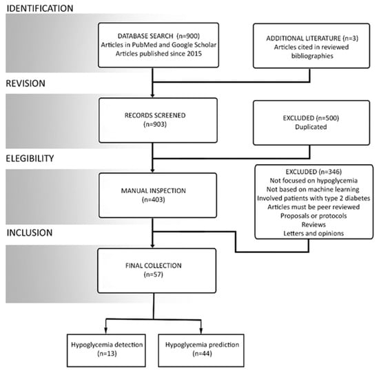 Manuscripts were searched through the advanced searching options in PubMed. The search was carried out by first combining the keywords ‘machine learning’ and ‘hypoglycemia’ with the help of an ‘AND’ logical operator to search all the fields provided in PubMed advanced search option. This search yielded a total of 41 manuscripts. Later, keywords ‘artificial intelligence’ and ‘hypoglycemia’ were searched together for all the fields, which yielded a total of 47 manuscripts. ‘Machine learning’ was also searched together with ‘blood glucose prediction’, yielding a total of 119 manuscripts. The keywords ‘hypoglycemia’ and ‘machine learning’ were then searched together with a series of other keywords by using the same logical operator to obtain the following results: prediction (23), detection (10), hypoglycemic event (15), and adverse glycemic event (4). The keyword ‘hypoglycemia’ was then solely searched with other keywords using the logical operator yielding the following results: support vector machine (9), random forest (15), deep learning (8), ANN (6), supervised learning (21), and clustering (82). In google scholar, keywords ‘machine learning’, and ‘hypoglycemia’ were searched. This search was carried out to expand the pool of the total shortlisted manuscripts. A total of 500 manuscripts were searched using google scholar. All these individual searches were then combined together to form a grand pool of 900 manuscripts. Here, it is important to understand that the majority of the manuscript searched in both google scholar and PubMed were similar because both platforms provide distinct methods of article searching. A thorough review of the selected manuscript pool was performed. Moreover, the bibliographies of the selected manuscripts were looked into for a detailed analysis of the manuscripts cited in these works. The shortlisted manuscripts were then scrutinized to obtained the final collection of 57 papers by using the methodology given in Figure 1.