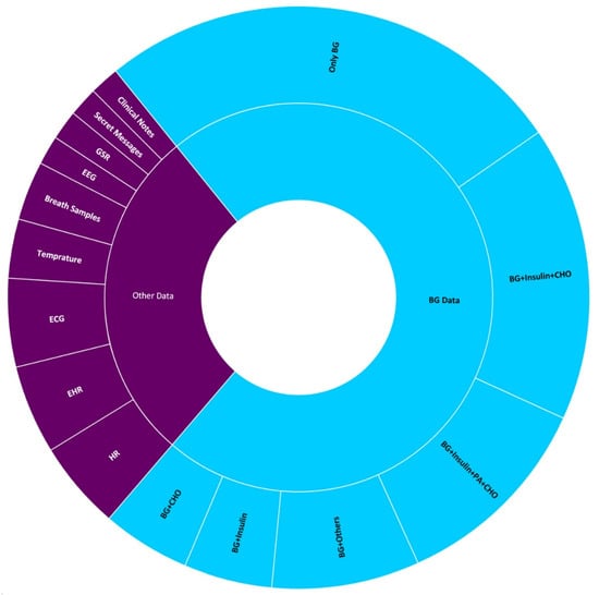 Moreover, of the works that use BG for hypoglycemia detection, some make use of sole BG data while others use BG plus a combination of different types of data such as insulin, CHO, and PA data, etc. The distribution of different BG data combinations may be observed in Figure 2. About 36.36% of the manuscripts used BG data alone for hypoglycemia prediction; 6.82% of manuscripts predicted hypoglycemia by using BG combined with insulin data, and an equal amount of research work used BG combined with CHO. A total of 22.73% works used BG combined with insulin, CHO, and PA data. A total of 15.91% studies used BG, insulin, CHO, and PA data in conjunction while 11.36% studies made use of BG in combination with other sources of data, e.g., HR and ECG, etc.
