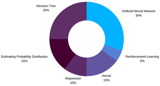 ML designers have a variety of ML algorithms at their disposal while implementing new designs. The choice of an ML algorithm is guided by multiple factors, i.e., the type of data used to train the model, the number of features, and most importantly, the quantity of data available []. The literature reviewed here shows that a total of 34 unique ML algorithms have been used as can be observed in Table 1 and Table 2. These algorithms have been categorized into six major families of ML algorithms as shown in Figure 3. The most common of these families is the ANNs followed by the DTs, kernels, and others. If we talk about the most famous individual ML models, RF has been the choice of designers followed by SVM.