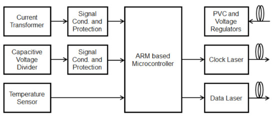 The powering and the communication between the sensor and processing unit are performed using three 62.5/125 μm multimode optical fibers, which ensure the high electrical insulation between the medium voltage and ground. The power path is composed of one high power laser model TY976 from Skyera (PoF Laser), placed in the processing unit and operating in the wavelength of 976 nm with a typical output power of 2.0 W, an optical fiber rugged cable, and one Si-based PVC model YCH-L200 PPC, from MH GoPower, placed in the sensor unit. The data path (data and clock) is performed by two low-power and low-cost vertical-cavity surface-emitting lasers (VCSEL) model OPV314YAT from Optek/TT Electronics, which are placed in the sensor unit, and operating in the wavelength of 850 nm with typical 1.0 mW output power. One laser is used for clock transmission and, the other one is used for the data signal. The microcontroller driver each laser directly using a polarization resistor.