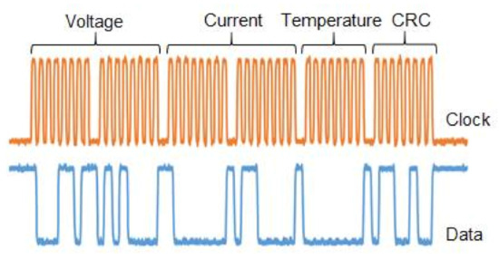 The sensor unit uses an ARM (advanced RISC machine) microcontroller (model MKL25Z128VLK4) to acquire data of voltage, current, and temperature. It calculates the CRC (cyclic redundancy check) and sends the data frame to the processing unit. Voltage and current samples have 16 bits, temperature samples and CRC word have 8 bits. A data frame has a total of 48 bits and it is sent every 40 µs to the processing unit. The sensor sample rate is 25 kHz. The protocol used to send frame data from the sensor to the processing unit is quasi-SPI (serial peripheral interface). A default SPI protocol is implemented using four wires (CLK, CS, MOSI, MISO) for a duplex communication or three-wire (CLK, CS, MOSI) for one-way communication. In this application, the SPI was implemented using two wires clock (CLK) and data (MISO). The SPI protocol enables high-speed communication (10 Mbit/s) suitable for a high sample rate. Figure 4 shows an example of a data frame used in the communication from the sensor unit to the processing unit.