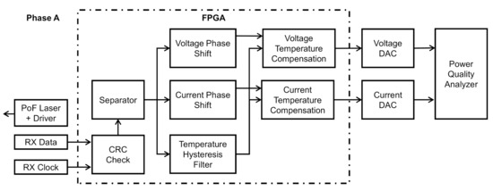 Figure 5 shows the functional block diagram of the processing unit. For a better understanding, this diagram is limited to phase A. The data and clock signals from the sensor unit are sent to two optical silicon fiber optic receivers model OPF482 from Optek/TT Electronics (Carrollton, TX, USA), placed in the processing unit using two optical fibers of the same rugged cable described before. In the processing unit, there are also a field-programmable gate array (FPGA) and a power quality analyzer model MQ700 from IMS Power Quality.