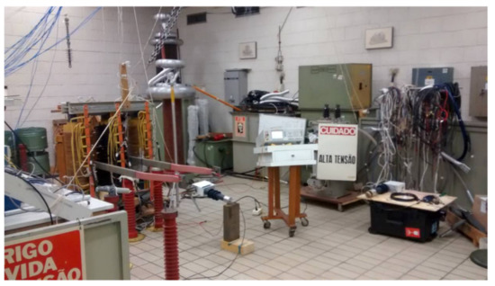 The performance of the LPIT (Figure 1b) was first evaluated in a laboratory environment, to verify the performance in terms of accuracy and bandwidth, for current and voltage measurements [31,32]. Further, the sensor was submitted to temperature variation and it was evaluated under this condition. Figure 6 shows one set-up used to characterize the sensor in a high-voltage laboratory.