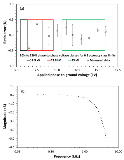 Voltage sensor characterization: (a) ratio error and (b) bandwidth.