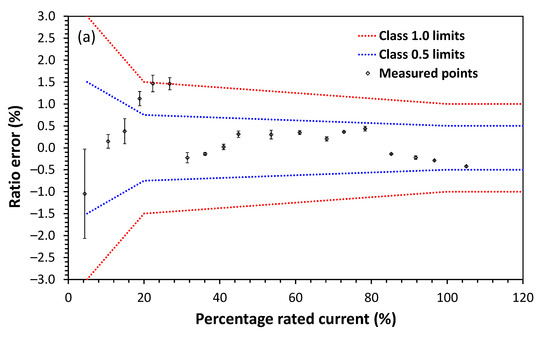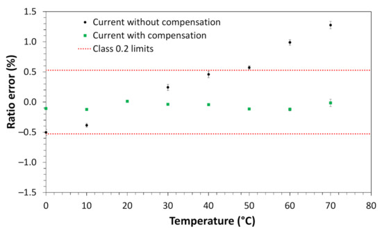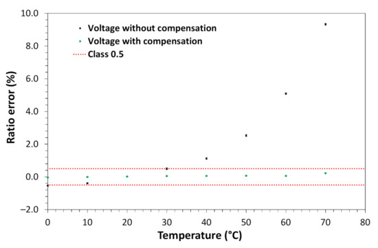 As shown in Figure 9, the voltage ratio error was reduced from about 10% to a variation of about 0.32% in the entire operating temperature range. The error reached about 0.32% was below the stipulated 0.5 class limit. In Figure 10, the current ratio error was reduced from about 1.75% to about 0.125%, in the entire operating temperature range. The error reached of about 0.125% was below the 0.2 class limit of this sensor (~0.53% for the 13.33% of the rated current).