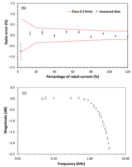 Current sensor characterization: (a) ratio error for 1.25–30 A range for the rated current of 25 A, (b) ratio error for 37.5–900 A range for the rated current of 750 A and (c) bandwidth.