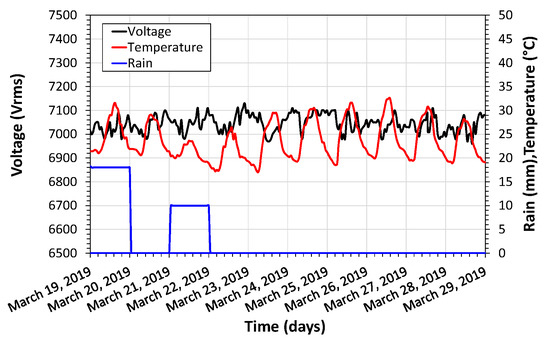 Through the temperature variation, the day and night periods can be noticed during the test days. There were also two episodes of rain, as shown in Figure 13. The range of temperature variation was 15.6 °C. The maximum precipitation was 25 mm in this test period. The maximum variation in the measured voltage was 170 V, corresponding to 2.41% of the total variation of the average voltage. The measured values of minimum and maximum voltage were 6.960 kV and 7.043 kV, respectively, a variation of −1.19% and 1.22%. This variation for voltage does not exceed the maximum allowed by Brazilian electricity standards [37].