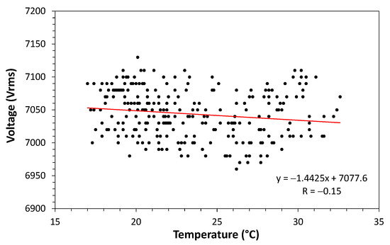 A correlation plot between voltage and temperature was obtained from the data in Figure 13. The obtained correlation is shown in Figure 14. To quantify the correlation, we make use of the Pearson correlation [38]. Pearson’s correlation coefficient measures the degree of correlation (and whether it is positive or negative) between two variables. According to criteria given in [38], the degree of correlation is classified in: