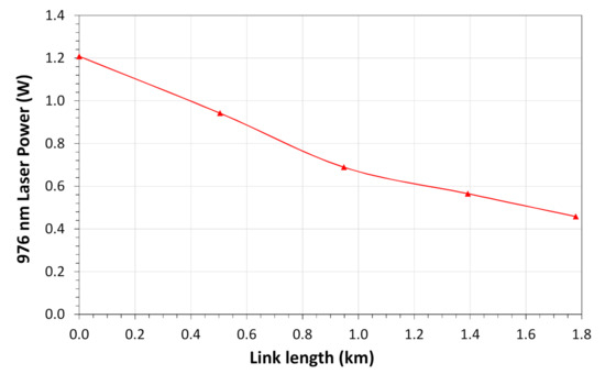 Before starting the field test, we evaluated the maximum distance possible to powering the sensor unit using optical fibers concatenation of the SN and additional optical fibers spools. In the test, the distance was increased from the sensor to the processing unit using extra optical fiber spoons. The optical power to the sensor unit was measured in the OTB and the signal quality was measured in the processing unit using an oscilloscope. Figure 15 shows the 976 nm optical power level versus the link length. The maximum distance obtained with an acceptable signal quality was 1.8 km operating the PoF laser with 1.2 W. However, considering that the maximum optical power of this laser is 2 W a maximum distance of 2.8 km can be reached.