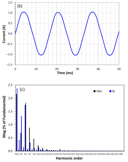 (a) Waveforms of the voltage, (b) current, and (c) the harmonics content for these signals.
