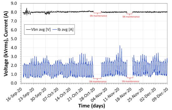 Figure 17 shows the voltage and current collected for approximately 3 months. In this test period, the voltage measured by the system had an RMS value of 8 kV, suitable for a 13.8 kV phase-to-phase grid. The maximum and minimum current measurement for the sensor was 0.51 A and 4.23 A suitable for the typical load of the campus. The measured values of minimum and maximum voltage were 7.67 kV and 8.47 kV respectively with a variation of −3.78% and 6.35%. Like the previous test, this variation in voltage measurement does not exceed the maximum allowed by Brazilian electricity standards [37], except for the measurement of maximum voltage that exceeds +1.35% from the limit.