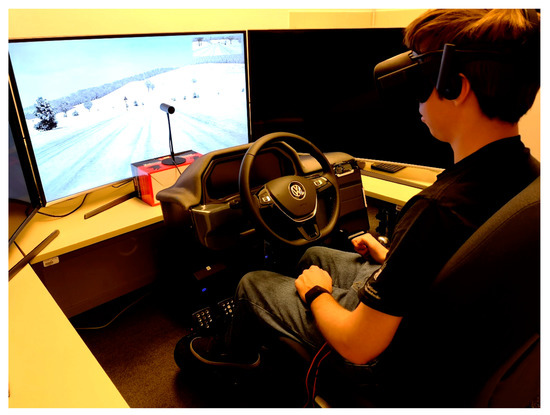 Participant prior to countryside ride in NervtechTM driving simulator at the University of Ljubljana, Faculty of Electrical Engineering. The central UHD display was used to show the view of the driver from within the VR headset to the experimenter.