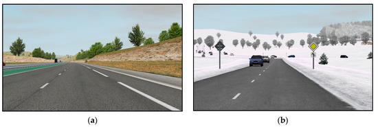 Screenshots of the driving scenarios: (a) highway driving with low traffic; (b) winding country road with many vehicles and icy roads.
