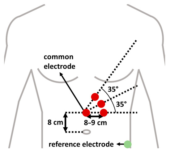 EGG was measured with a 3-channel amplification and filtering device [32] and Biopac UIM100C MP150 analog-to-digital converter (Biopac Systems, Goleta, CA, USA) [67]. Signal gain was 1000, sampling frequency 2 Hz and the resolution of A/D conversion 16 bits. The MP150 unit was connected with a cross-over Ethernet cable to the monitoring computer where real-time EGG data was stored on the hard drive. Five Ag/AgCl surface electrodes (H92SG, Kendall/Covidien, Dublin, Ireland) were placed on participant’s body for measuring 3-channel EGG. Following the recommendations of recent research [35,47,58], we prepared skin surface with abrasive gel and medical gasoline in order to decrease skin-electrode contact impedance and positioned the electrodes as demonstrated in Figure 3.