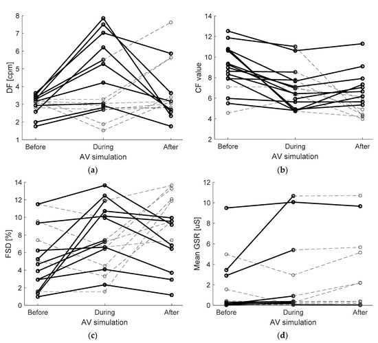 Graphical presentations of parameters that revealed a significant difference between the three trials (before, during and after the AV simulation). Dominant frequency (DF) is plotted in graph (a), Crest factor (CF) in graph (b), percentage of PSD with a value, higher than maximum magnitude of power spectrum density (MFM) divided by 4 (FSD) in graph (c) and mean GSR values in graph (d). Thick black lines indicate resulting trends (increase or decrease) that appear as expected (see Table 2). Dashed grey lines indicate trends, opposite than expected.