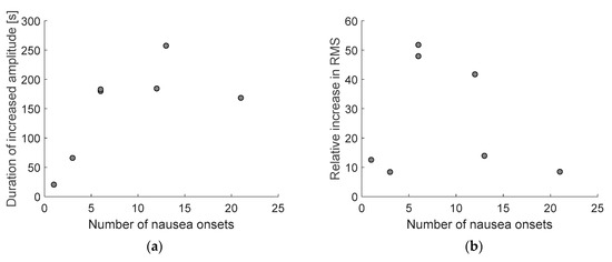 Additionally, our expectations were that those increases in amplitude (both the duration and RMS) would be highly correlated with number of nausea onsets, i.e., button presses. It seems (see Figure 6) that the correlation exists only between the duration of amplitude increase and number of nausea onsets, but not between the relative increase in RMS and nausea onsets. This could probably be due to non-standardized procedure of measuring nausea by pressing a button, where every participant could have his or her own expectations and thresholds for reporting nausea and its severity. Standardization of such methodology for continuous measurements of sickness would be beneficial for any research regarding motion or simulation sickness. Nevertheless, the duration of increased amplitude appears to be a good indicator of nausea. Increased amplitude of EGG seems to appear almost simultaneously with nausea reports, indicating a promising area for further research of timings or delays between different sickness indicators. It would be of significant importance to user interface and simulator designers to know exactly when or how long after (or before) the first indication can sickness be expected.