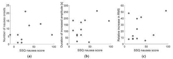This study included two subjective measurements, signalization of nausea onsets by pressing a button and nausea score from simulator sickness questionnaire (SSQ). SSQ was collected pre and post the driving session. It should be noted that the post SSQ was collected after the third EGG measurement session (Trial 3) in order not to interrupt the EGG recording and corrupt skin-electrode impedance contact. Consequentially the participants had about 10 min extra time to relax after being exposed to VR driving simulation and prior to questionnaire. Therefore, data collected with SSQ may be of limited significance. Although SSQ nausea score and signalized number of nausea onsets (the two subjective measurements) did not appear significantly correlated, the correlation exists between SSQ nausea score and amplitude increases in EGG signal. Both, the duration of increased amplitude and relative increase in RMS value are significantly correlated with SSQ suggesting that the proposed method of pressing the button to signalize nausea onset or detecting it though EGG amplitude increases could be two very efficient approaches.