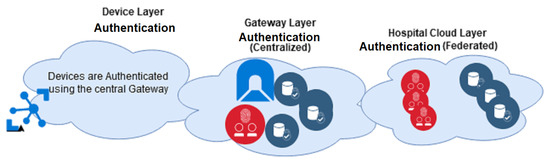 The proposed CloudIoT based healthcare system has three layers: the Device layer, Gateway layer, and the Hospital/Public healthcare cloud layer. Figure 3 illustrates these layers. The Device layer is in the patient’s network where the devices are authenticated using a central gateway. The Gateway layer is where the patient’s authentication credentials are stored and where encryption and any other initial computation are done. The Gateway layer maintains a Centralised access control that facilitates a user-centric restriction on sharing data with the public healthcare cloud. The last layer is the Hospital cloud layer which resides on the public cloud and adopts a Federated IDMS strategy.