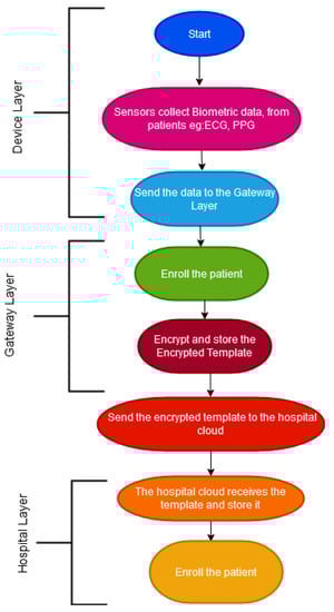 - Gateway Layer: The gateway layer enrols the patient and saves the template. The biometric template is secured using the Homomorphic algorithm. The encrypted template is then sent to the hospital cloud.