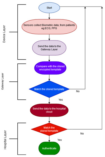 - The Gateway layer sends the data to the hospital cloud. The user is then authenticated against the stored encrypted biometric template versus the newly arrived template received from the gateway. If the template matches, the user is fully authenticated.