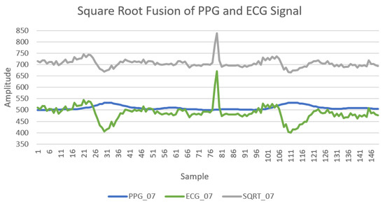 In Equation (8), the represents the PPG amplitude point and represents the ECG amplitude point both at a given time. In preparation of phases 1 and 2 of this experiment, the fused signal as well as the PPG and ECG signals were stored in a separate data file (“mergedTable1.mat”). This and the relevant data processing code are published on GitHub [43]. It is worth noting that during the training phase of the model, the minor class (valid user) parameters were duplicated in order to avoid creating an imbalance of valid user samples. A comparative graph of a participant’s PPG and ECG signals along with the resultant fused signal is provided in Figure 6.
