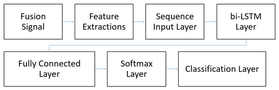 In phase two of the experiment, we loaded the fused signal from the imported file “mergedTable1.mat” into the ML model. In this phase, the ML model had a similar architecture to the one depicted in Figure 7. Using a sample frequency of 150 Hz, each user had 182 sequences of samples. Hence, the total sample size of data corresponding to the 25 users was over 4700 sequences of fused signals. These sequences of signals were used to extract the features using Equations (9) and (10). Next, the features extracted by the equations were fed into the sequence input layer to train the ML model as illustrated in Figure 7.