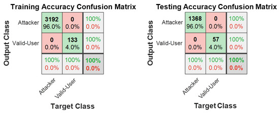 In phase two of the experiment, the dataset sample size was increased from 10 to 25 users. This allowed us to further test and confirm the performance of the proposed model. The results are presented in Figure 9 as a confusion matrix. Figure 9 shows that the performance of the training and testing setups both achieved 100% accuracy. Although the experiment was set up with a 70 to 30 train and test ratio, we discovered that a smaller sample size was also sufficient to train the model in recognising valid users—even after reducing the train/test ratio to 20/80.