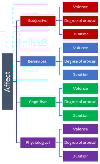Generally, emotions are considered to consist of four different components: Subjective, Behavioral, Cognitive, and Physiological []. Each component in turn has a valence, or direction—whether the experience is positive or negative. Furthermore, they may also vary in the degree of arousal and duration. This conceptual framework of emotion is illustrated in Figure 1. However, while we use this framework to discuss the matter here, the precise labels used to differentiate different components of emotions vary greatly among different research methodologies [].