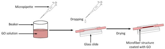The fabrication of the tapered optical microfiber was performed using the Vytran glass processing machine according to the procedure reported in [10]. Briefly, at first, the polymeric coating of the optical fiber was stripped for several centimeters using a fiber stripper and then washed with alcohol. The optical fiber was then mounted on the glass processing machine, where the area to be tapered is just above the filament. The two ends of the optical fiber were attached to the fiber holding stage. The bare multimode silica optical fiber, with core and cladding diameters of 62.5 and 125 µm, was then softened by the filament as a heating element. Once softened, the optical fiber was stretched by the holding stage at a constant pulling speed of 1 mm/s with filament heating power set at 38 W to attain a waist length of 15 mm and waist diameter of 20 µm. Next, the sensor was fixed on a glass substrate, washed with ethanol and deionized water to remove impurities, and subsequently placed in an oven with a temperature of 70 °C for 0.5 h. We used GO powders that were synthesized using the simplified Hummer’s method [23]. Later, 50 mg of as-prepared GO sample was dispersed in 50 mL of deionized water and sonicated for 1 h. A drop of GO solution (30 µL) was cast onto the tapered region. The whole structure was placed in an oven with a temperature of 40 °C for 4 h. Figure 1 shows the schematic for the preparation of GO coating on the tapered optical microfiber sensor.