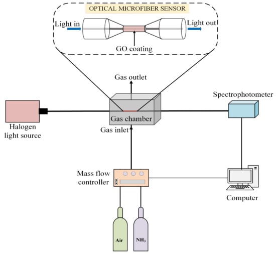 Schematic of the experimental setup for optical microfiber ammonia (NH3) gas sensor.
