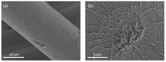 (a) Field scanning electron microscope (FESEM) image of GO-coated optical microfiber; (b) magnified image of the GO surface.