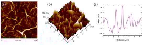 From the FESEM image of GO-coated tapered optical microfiber as shown in Figure 3a, it can be observed that the GO nanomaterial adhered well to the surface of the optical fiber. Figure 3b shows a magnified FESEM image of the GO-coated optical microfiber exhibiting a corrugated and wrinkled structure, which can be linked to the edges of the GO sheets [24]. The wrinkling is significant for GO surfaces in providing a high surface area for strong sensing performance. Figure 4a,b depict the two and three-dimensional AFM topography of the GO thin film, respectively, with a scan boundary area of 10 μm × 10 µm. The average surface roughness of the GO film was found to be ~24.12 nm. Rough sensing surface is important because it facilitates the diffusion of gas molecules into or out of the sensing layer [25]. Figure 4c shows the topographic curve of GO, which reveals an average height difference between rows of ~67.10 nm.
