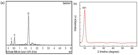 (a) Energy dispersion X-ray (EDX) spectrum of the GO-coated optical microfibers; (b) X-ray diffractometer (XRD) pattern of the prepared GO.
