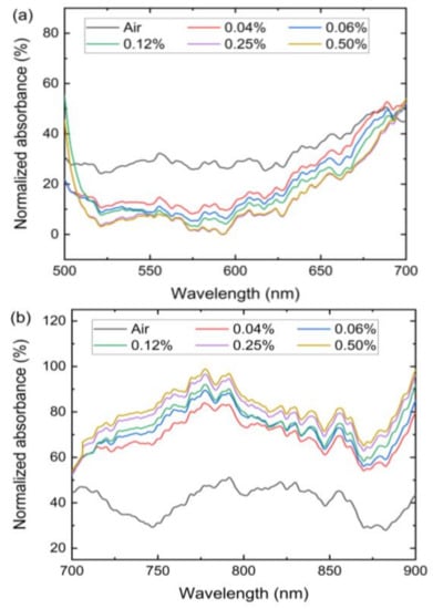 Figure 6a shows the absorbance behavior of the spectrum 500–700 nm when exposed to different concentrations of NH3. It can be observed that the absorbance response in this wavelength range changes with different concentrations of NH3. However, the nature of the absorbance change is different in the near-infrared wavelength range of 700–900 nm, as can be observed in Figure 6b. It can be noted that the absorbance in the visible wavelength range decreased with an increase in NH3 concentration while the absorbance in the near-infrared wavelength range increased with an increase in NH3 concentration. The absorbance response depends on the RI of the GO upon exposure to targeted gas, which in this case is NH3. The negative response of absorbance at the visible wavelength region indicated that the output power at the end of the sensor increased when the NH3 was exposed to the sensor. Therefore, at the visible wavelength region, the GO nanomaterial yielded low or negative absorption when exposed to NH3 gas. The opposite was the case when the sensor was exposed to NH3 gas in the near-infrared wavelength region.