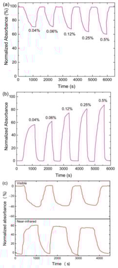 The plot of absorbance change against NH3 concentration is shown in Figure 8a. The changes in the absorbance depend on the NH3 concentration. In our experiment, the Sensitivity S is defined as the slope of the calibration graph given by S = ΔA/ΔC, where ΔA is the change in absorbance response, and ΔC is the change in NH3 gas concentrations. The near-infrared wavelength region showed higher sensitivity towards NH3 gas concentration compared to the sensitivity observed in the visible wavelength region. The sensitivities of 26.99 AU/% and 61.78 AU/% were obtained for the visible and near-infrared wavelength region, respectively. The sensitivity in the near-infrared wavelength region was more than twice the sensitivity in the visible wavelength region. Thus, operational bandwidth plays a role in determining the sensor’s sensitivity. The RI variation of GO film in response to NH3 gas exposure depends on factors such as film thickness, absorption properties, and wavelength of light. Previous studies indicated that the sensitivity of NH3 gas to materials such as GO [26] and polyalanine [27] depends also on the wavelength of light used. Suppose that GO film has a complex RI of ηc = ηr + ik where ηr is the real part of the RI and k is the extinction coefficient. The extinction coefficient is related to the absorption coefficient, α = 4πk⁄λ where λ is the wavelength of light. The RI of material corresponds to a change in the propagation of light due to dielectric interactions and varies with the wavelength [26]. The easy transfer of GO to the microfiber by drying GO solution and provision of high surface area by the corrugated and wrinkled structure of GO enabled larger surface interaction between the GO and NH3 molecules at room temperature. The GO response towards NH3 gas reveals negative and positive absorbance responses for the visible and near-infrared wavelength regions, respectively. Therefore, this work provides an insight into the wavelength region where the sensitivity of the sensor is the highest.