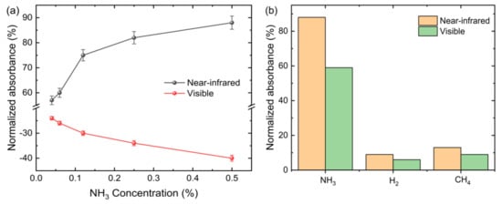 (a) Absorbance response changes as a function of NH3 concentrations for visible and near-infrared wavelength range; (b) selectivity of the optical microfiber sensor against H2, and CH4.