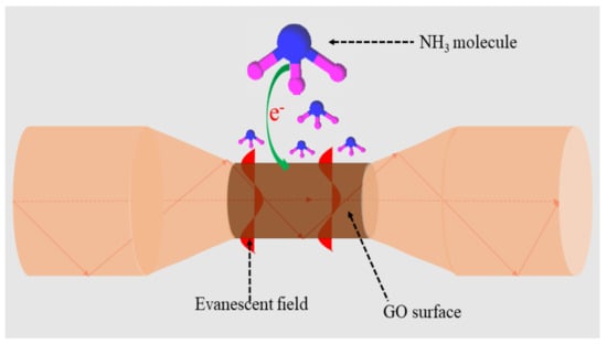Figure 9 illustrates the proposed sensing mechanism of the sensor. The sensing mechanism of the GO-coated optical microfiber sensor at room temperature can be explained based on charge transfer between NH3 and GO. When NH3 is adsorbed by GO, it donates an electron on the surface of the carbon [34] as indicated in Equation (3). This charge transfer process would affect hole concentration in the GO, thereby changing its RI accordingly.
