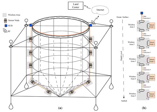 Example of underwater sensor network: (a) sensor network deployment in an offshore cage and (b) details of a network branch with five sensor nodes.