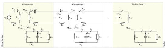Figure 2 presents the circuital model for the network branch shown in Figure 1b. As it was previously introduced, this circuit is divided by wireless areas. They are enumerated and identified with correlative numbers which are increased with the depth of the node. The first wireless area is physically located close the surface level of the ocean. This first wireless area includes a low frequency RFID sinusoidal source , a transmission antenna and its tunning capacitor . Each wireless area is designed to have at least one sensor node. The energy in the sensor node is received by antenna which has its own tunning capacitor . If there is a sensor node deeper than the current one, the wireless area includes a transmission antenna and its tunning capacitor connecting the current wireless area with the deeper one.