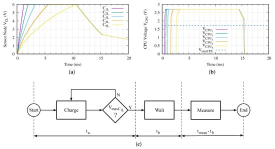 Once the fully charging time is determined, it is mandatory to study the supply voltage applied to the CPU of the sensor node in order to calculate the available measurement time. Certainly, the more time available, the better the solution. However, because we are planning to perform a single measurement, there is a minimum required time to set up the included instrument devices and run a measurement (). In this experiment, since the sensor node microprocessor is running at 8 , we have determined that it is 1.0 ms. However, in order to evaluate the sensor network, we set the minimum required measurement time to 2.0 ms. Figure 10 presents the voltage applied to each CPU of the proposed experiment.