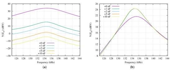 Frequency response of the sensor node load when the compensator capacitor is increased 1, 2, 5 and 10 nF in comparison with its optimal value: (a) First sensor node () changing its compensation capacitor and (b) deepest sensor node ().