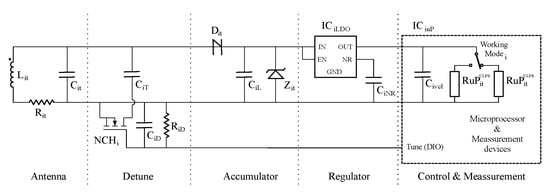 Figure 7 presents the equivalent schematics of the used sensor node to test our proposed charging method. This circuit includes a new stage called Detune in comparison with the original circuit introduced in Figure 4. The new stage is inserted in parallel between the Antenna and Accumulator stages. It also requires a control line from the microprocessor.