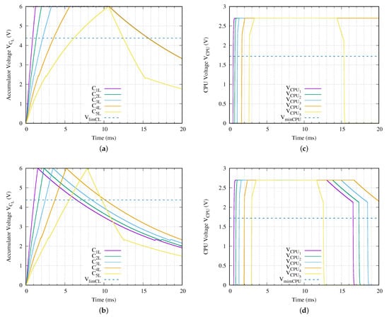 In a similar way, the regulator requires an input voltage range to work correctly. The output terminal of the regulated voltage is activated only when its input terminal voltage is above . So, during the charging of the energy accumulator capacitor, the smart circuit of the sensor node is turned on at (see the label 3 in Figure 3c). Then, the equivalent load over the charging process is increased. This effect is observed in label 4 of Figure 3b with the charging slope of .