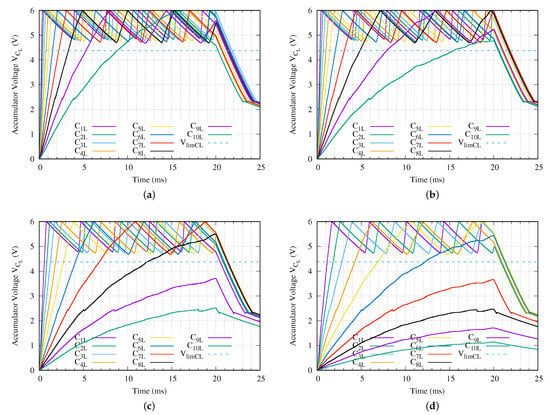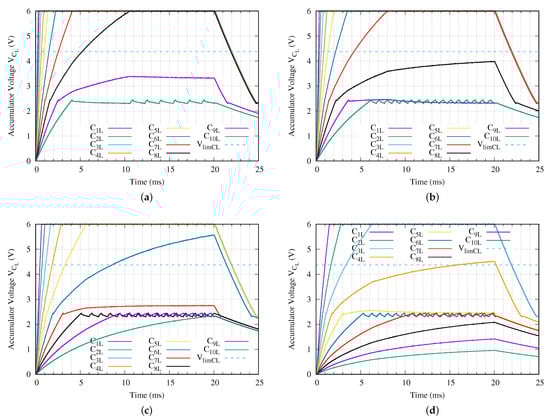 Energy accumulator capacitor voltage of each sensor node for a network branch with ten levels (N = 10) when a (a) = 24 V, (b) = 18 V, (c) = 10 V or (d) = 5 V peak–to–peak sinusoidal charging tone is applied using the proposed method.