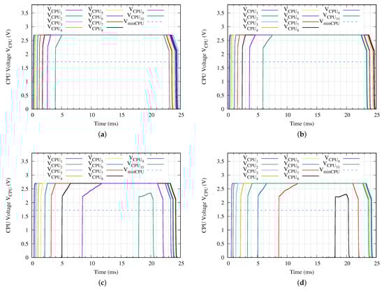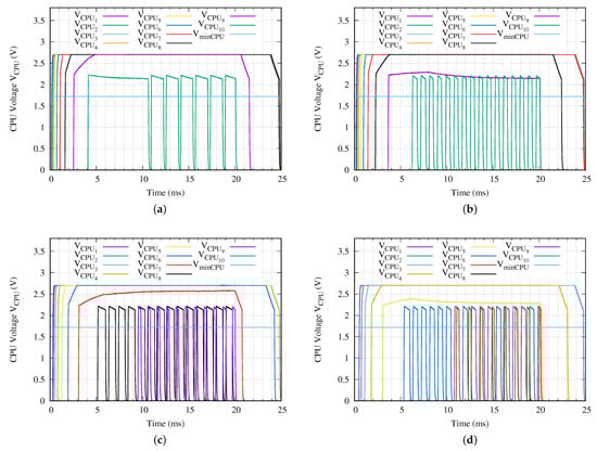 Voltage applied to each CPU for a network branch with ten sensor nodes (N = 10) when a (a) = 24 V, (b) = 18 V, (c) = 10 V or (d) = 5 V peak–to–peak sinusoidal charging tone is applied using the proposed method.