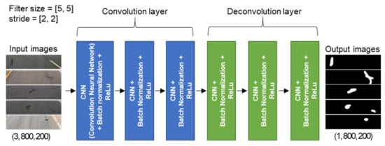 Figure 2 shows the structure of the simple DNN model installed in the smartphone. This model was developed to classify road-surface anomalies by analyzing the images captured in real time while driving. The FCN was designed to have six layers, excluding the input layer, consisting of three stride convolution layers and three stride deconvolution layers. There was no pooling layer. In each convolution layer, a 5 × 5 filter traversed the entire image at 2 × 2 stride intervals for computation. A rectified linear unit (ReLU) was used as the activation function, and 1959 road-surface images were used as training and validation data. Of these images, 599 contained road anomalies with the remainder containing shadows, vehicles, road facilities, road markings, etc., to exclude environmental impacts. Images were not augmented, such as by adjusting the brightness to compensate for changes in the ambient lighting, so these tests were mainly conducted during daylight hours. The FCN used in this study had a structure similar to that developed in a previous study [28], but was simplified so that FCN-based road-surface anomaly detection and acceleration measurement could be simultaneously performed by a smartphone.