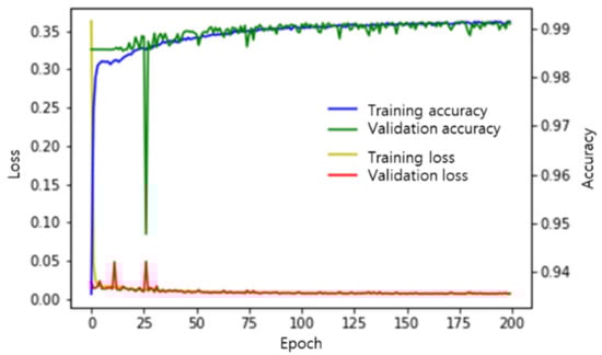 To train the FCN, the original 1920 × 800 images were cropped to 800 × 200. In each extracted image, the pixels associated with road-surface anomalies were labeled as 1 and the pixels without any anomaly were labeled as 0. (The output images in Figure 2 show the road-surface anomalies as pixel values of 255 to improve visibility, but their actual values were 1). Eighty percent of the images were used for model training, and the remaining 20% of the images were used for validation. The mean square error (MSE) was used as the loss function [29], and adaptive moment estimation (ADAM) was used as the optimization technique [30]. Figure 3 shows the loss and accuracy of the FCN inference model throughout the training iterations. The loss values for the training and validation data sets were measured in every epoch during training, and the model in which the loss value for the validation data set was the smallest was used.