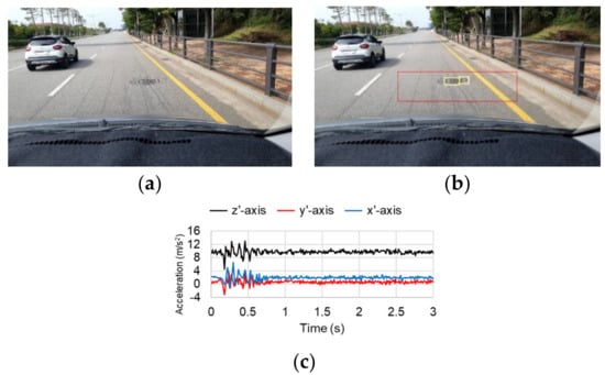 Figure 4 shows a typical image and the corresponding acceleration data. The smartphone camera was attached to the upper part of the windshield of a traveling vehicle to capture and store images of the road surface, shown in Figure 4a. Eriksson et al. [7] installed accelerometers in three different places inside a vehicle (the dashboard, the right side of the windshield, and in the embedded PC) and compared the signal quality, finding that the accelerometers attached to the dashboard and windshield produced similarly high-quality signals. Thus, Eriksson et al. [7] selected the dashboard, where it was easiest to attach the sensor; in this study, the windshield was selected as the installation location because it was necessary to simultaneously photograph the road surface using the smartphone camera. The collected images were input into the FCN model to detect road-surface anomalies. The road-surface anomalies in the region-of-interest (ROI) marked with a red box in Figure 4b were detected and are marked with yellow boxes. When the road-surface anomalies were detected, the three-axis accelerations (x′, y′, z′) of the smartphone were measured for 3 s, as shown in Figure 4c. In Figure 4, a manhole was detected as an anomaly in the ROI, and the corresponding acceleration change was measured by the smartphone. It can be observed that the measured accelerations varied significantly between 0 and 1 s as the vehicle passed over the manhole.
