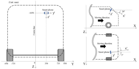 As shown in Figure 4a,b, road-surface images were captured with the smartphone in a rotated position. A fixing device was used to maintain a constant posture of the smartphone during driving. Figure 5 shows the initial orientation of the smartphone, which was attached to the windshield of the test vehicle. These tests were conducted using a sport utility vehicle (SUV) that was 1.925 m high, 1.920 m wide, and 5.15 m long, with a front wheel tread of 1.685 m and 0.215 m wide tires. The smartphone was installed on the inner surface of the vehicle windshield at a height of approximately 1.65 m from the ground, and at a distance of 0.35 m toward the passenger seat from the center of the vehicle. The direction of gravity was defined as the Z-axis of the global coordinate system, and the X- and Y-axes were defined as the longitudinal and lateral directions of the vehicle, respectively. The orientation of the smartphone was determined by rotating it 20° around the y’-axis so that its camera could visualize the road surface in the X–Z plane. The smartphone was also rotated 5° around the z′-axis so that the camera could visualize the centerline of the road in the X–Y plane. The smartphone was installed so that it could not rotate around the x′-axis.